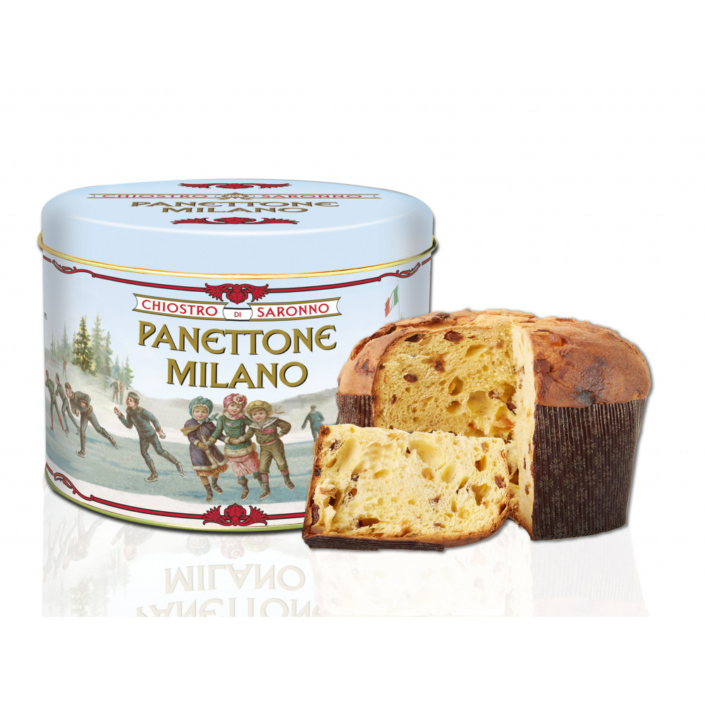 Panettone mit Rosinen und kandierten Schalen, Metalldose mit Vintage-Illustration. Der Panettone Chiostro di Saronno wird nach dem traditionellen Rezept und Kriterien, durch eine langsame und natürliche Hefe hergestellt und alle Zutaten, von Mehl zu Milch, Eier zu Butter, kandierte Früchte zu Hefe, sind natürlichen Ursprungs streng frisch und echt, frei von Konservierungsstoffen und Farbstoffen.