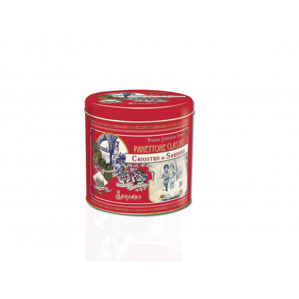Panettone mit Rosinen und kandierten Schalen, Metalldose mit Vintage-Illustration. Der Panettone Chiostro di Saronno wird nach dem traditionellen Rezept und Kriterien, durch eine langsame und natürliche Hefe hergestellt und alle Zutaten, von Mehl zu Milch, Eier zu Butter, kandierte Früchte zu Hefe, sind natürlichen Ursprungs, frei von Konservierungsstoffen und Farbstoffen.